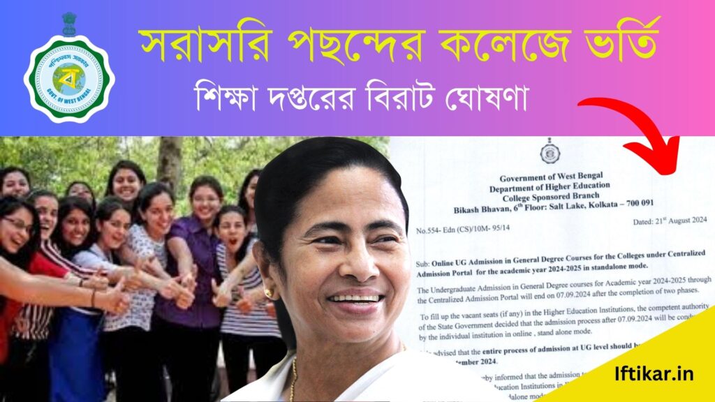 সম্প্রতি উচ্চশিক্ষা দপ্তরের তরফ থেকে ২১শে আগস্ট ২০২৪ একটি বিজ্ঞপ্তির মাধ্যমে জানানো হয়েছে সেন্ট্রালাইজড পোর্টালের মাধ্যমে এডমিশন প্রক্রিয়ার লাস্ট ডেট হল ৭ সেপ্টেম্বর, এরপর প্রতিটি কলেজের ফাঁকা সিটগুলিতে ছাত্রছাত্রীরা কলেজের নির্দিষ্ট পোর্টালের মাধ্যমে অনলাইনে আবেদন করে ভর্তি হতে পারবে। ছাত্র-ছাত্রীরা ৭ই সেপ্টেম্বরের পর আগামী ৩১শে সেপ্টেম্বর পর্যন্ত অনলাইনে আবেদন জানাতে পারবে।